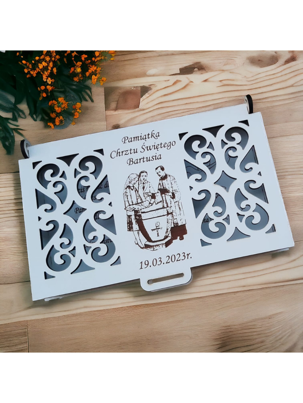 Pamiątka Chrztu Świętego w formie oryginalnego drewnianego pudełka to unikalny pomysł na prezent. Produkt wykonany jest z drewnianej sklejki
